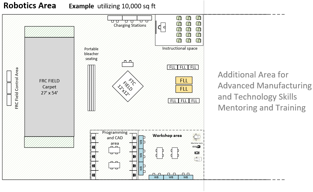 - A full scale permanent FIRST Robotics Competition field for high school level, FIRST Tech Challenge field, for middle and high school programs and FIRST LEGO League playing tables for elementary and middle school programs