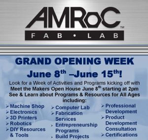 Doors open to the public starting June 8th at 2pm with a series of programs and events running through June 15 to introduce the general public to AMRoC Fab Lab. Activities actually start with our first First Fridays at the Fab Lab, Friday June 7, at 6:30pm. The following day, on Friday June 8th, starting at 2pm, we’re hosting a Meet the Makers Open House , where visitors can meet many of our great program partners and sponsors, and see and learn about programs and resources for all ages including:
