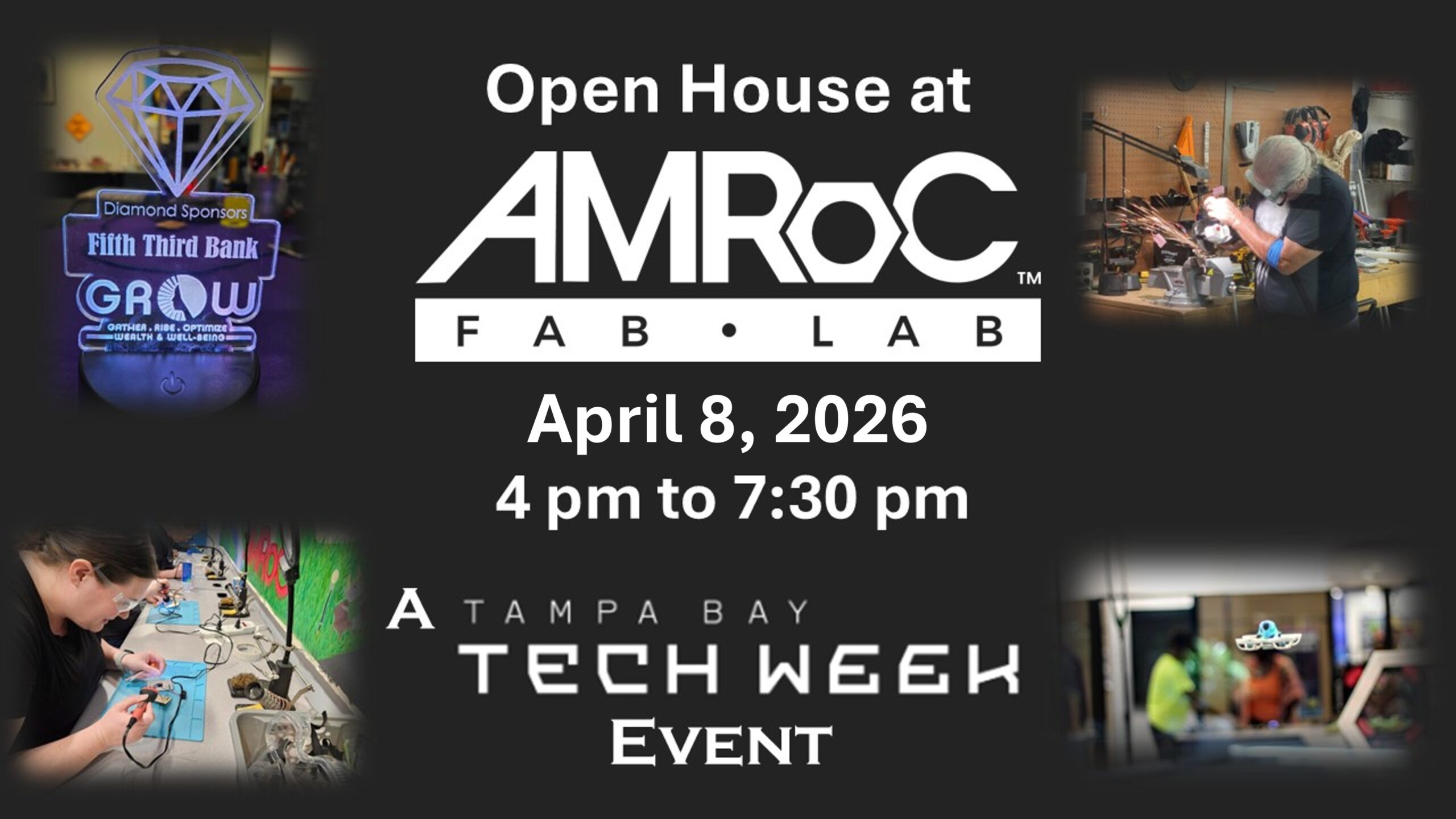Join us for a Tampa Bay Tech Week Open House from at AMRoC Fab Lab on April 8 from 4 pm to 7: 30 pm to explore Tampa Bay‘s only public fabrication lab where entrepreneurs, innovators and inventors, and small business owners can get design, and prototyping support, access 3D printing and laser cutting resources, find meeting and networking space and more.